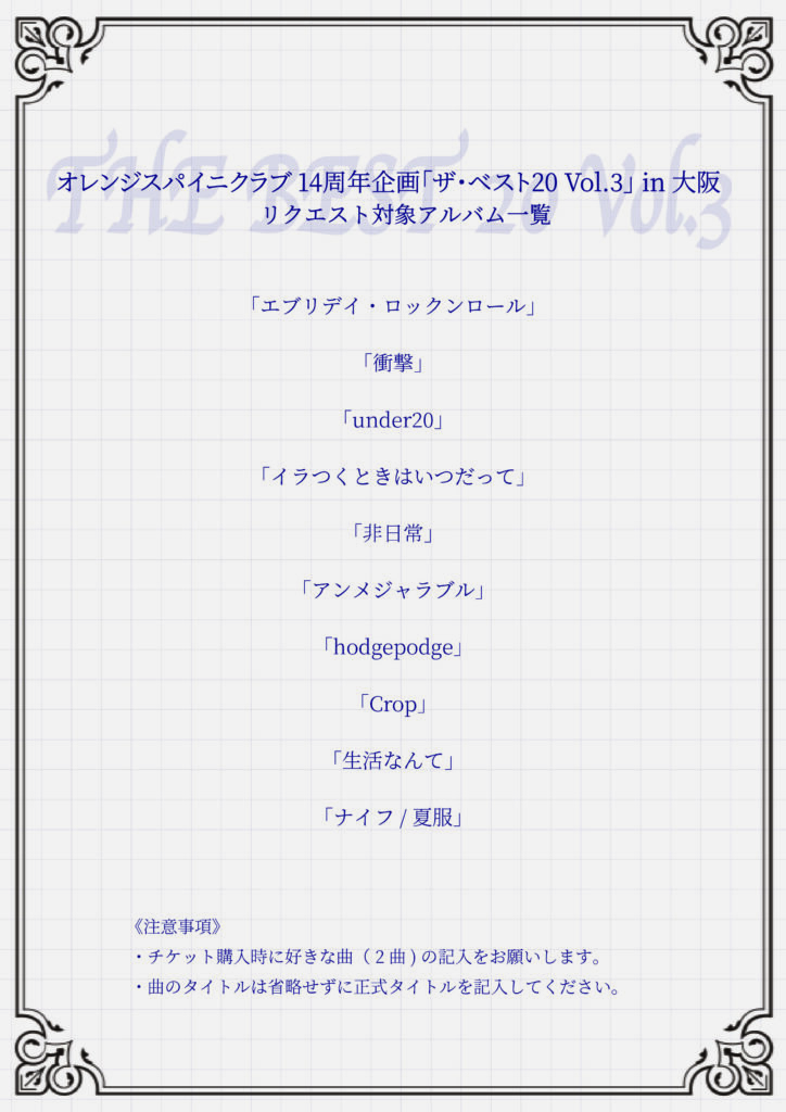 【ライブ情報】3/7(土) @ 大阪・バナナホール にて、オレンジスパイニクラブ 14周年企画「ザ・ベスト20 Vol.3」開催決定!